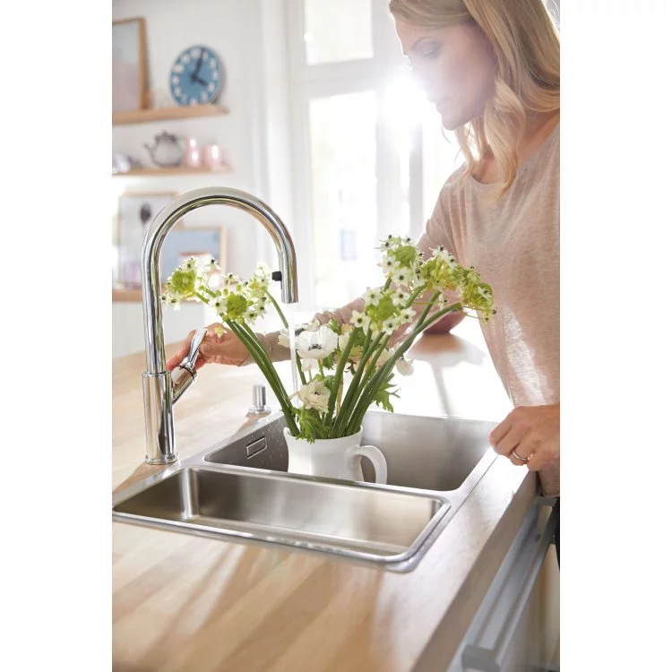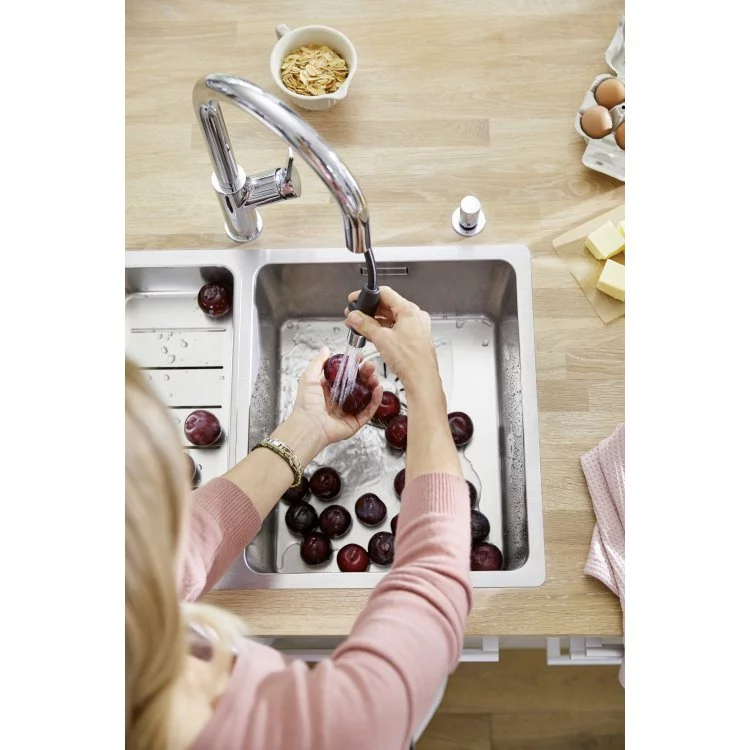 BLANCO CARENA-S Vario - sa jedne strane tako smerna svojim oblikom, s druge strane tako smela svojim funkcijama. Crevo koje se izvlači i dugme za promenu mlaza su dobro skriveni da ona prosto pleni jednostavnošću za one koji to preferiraju ???? , a druge strane nećete biti uskraćeni za funkcionalnosti koje su postale neizostavne za današnje vreme. Hrom površina čini je lako uklopivom u sve tipove i stilove kuhinja.