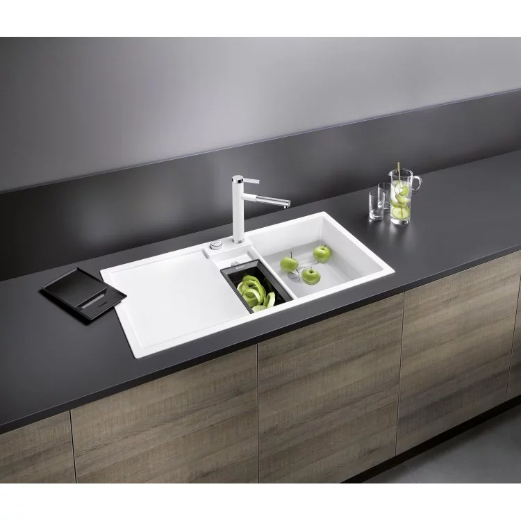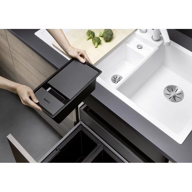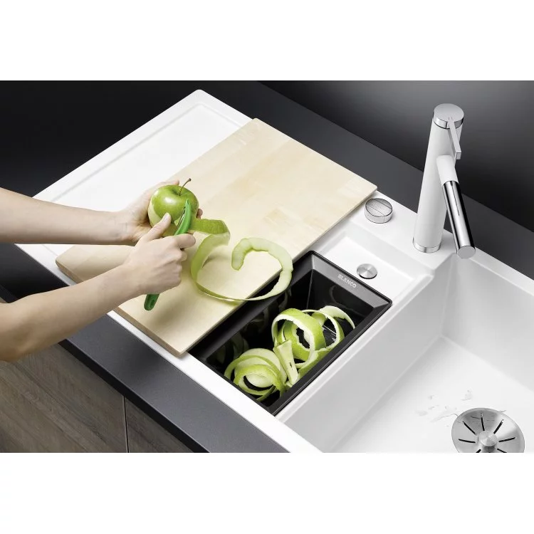Ovaj model sudopere donosi inovativan koncept za optimalnu organizaciju tokom pripreme hrane. Karakteriše ga veliko prostrano glavno korito kao i centralno malo korito u koje savršeno staje mala kutija za odlaganje otpada koju dobijate uz sudoperu. Tako da je u radnom procesu sve na jednom mestu, lako dostupno. Preporuka je ovu sudoperu uzeti u kombinaciji sa BLANCO sistemom za otpad iz serije FLEXON II i SELECT II , jer se mala kutija za otpad može odložiti u njih. Istražite materijal SILGRANIT® ovde , i otkrijte zašto je ovo najprodavaniji materijal granitnih sudopera u svetu.