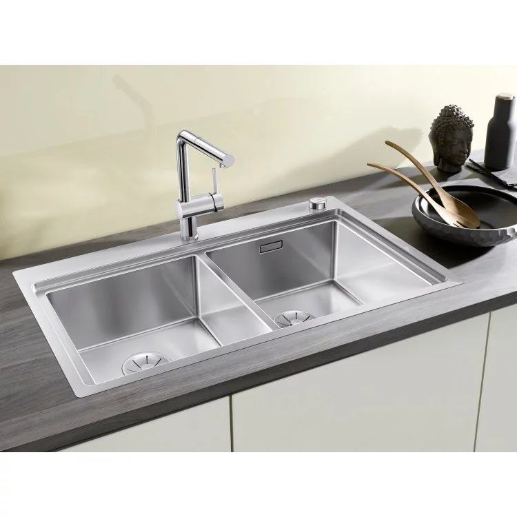 Ovaj model ima dva jednaka korita, što je idealno za istovremeno obavljanje više kuhinjskih poslova – pranje, ispiranje, ceđenje. Specijalne podloge smanjuju buku pri radu sa vodom i posuđem. Sudopera se ugrađuje u ravni sa radnom pločom, što doprinosi vizuelnoj čistoći i olakšava čišćenje. Dubina korita 195 centimetara. Pogodna za kuhinjske ormariće širine 80 centimetara. Daljinsko upravljanje čepom omogućava otvaranje i zatvaranje odvoda bez kontakta sa vodom – higijenski i praktično. Dva jednaka korita idealna za istovremeno obavljanje više kuhinjskih poslova – pranje, ispiranje, ceđenje.