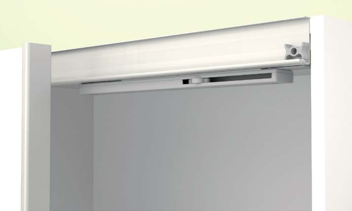 Sistem za usporeno i tiho zatvaranje vrata trokrilnog ormara Domino FGV. Idealno rešenje za nameštaj sa kliznim vratima, omogućava kontrolisano zatvaranje bez udarca i produžava vek trajanja okova.