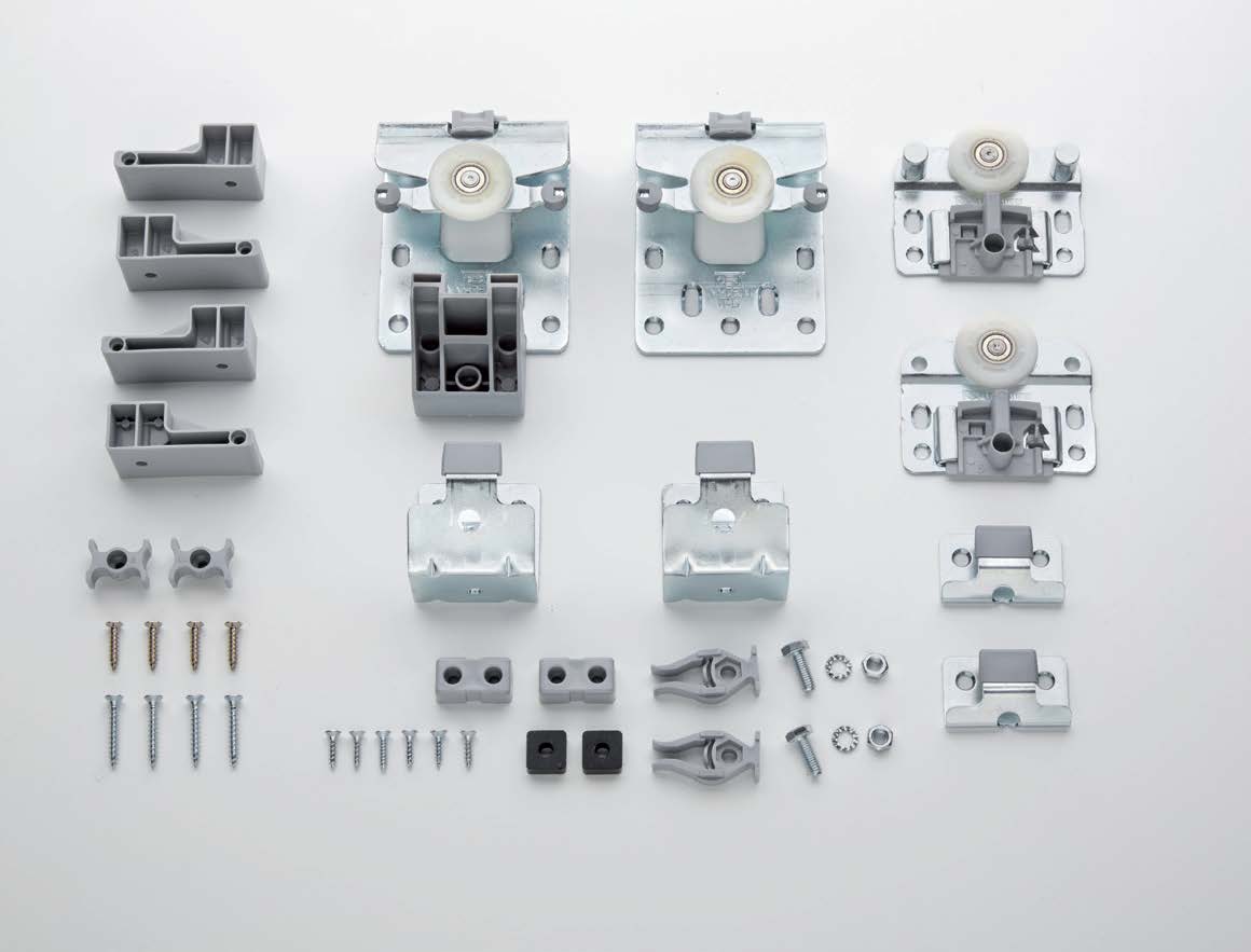Komplet Domino FGV za dvokrilna klizna vrata, dostupan za debljinu vrata od 16–21 mm i 22–28 mm. Pruža stabilnu montažu, sigurnost protiv podizanja i tehnologiju SlowMotion za kontrolisano zatvaranje.