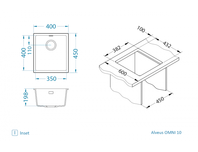 Alveus OMNI granitne sudopere sa uskom gornjom ivicom debljine 7 mm. Dostupno u šest nijansi boja: G11, G22, G55, G81, G91 i G90 (deep black). Tip ugradnje može biti: podgradni (U) i usadni (I). DIMENZIJA SUDOPERE 400 x 450 mm DIMENZIJA POSUDE 350 x 400 x 198 mm