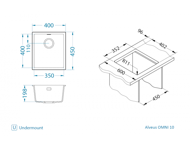 Alveus OMNI granitne sudopere sa uskom gornjom ivicom debljine 7 mm. Dostupno u šest nijansi boja: G11, G22, G55, G81, G91 i G90 (deep black). Tip ugradnje može biti: podgradni (U) i usadni (I). DIMENZIJA SUDOPERE 400 x 450 mm DIMENZIJA POSUDE 350 x 400 x 198 mm