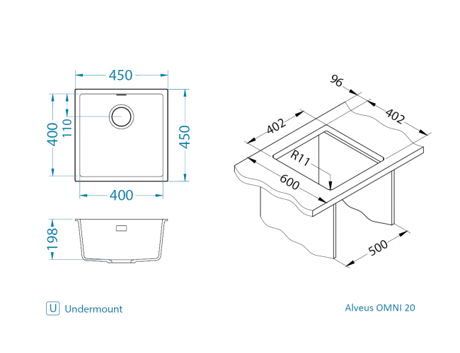 Alveus OMNI granitne sudopere sa uskom gornjom ivicom debljine 7 mm. Tip ugradnje može biti: podgradni (U) i usadni (I). DIMENZIJA SUDOPERE 400 x 450 mm DIMENZIJA POSUDE 400 x 400 x 198 mm