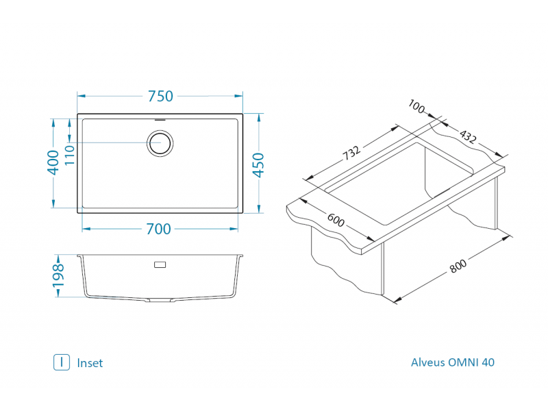 Alveus OMNI granitne sudopere sa uskom gornjom ivicom debljine 7 mm. Tip ugradnje može biti: podgradni (U) i usadni (I). DIMENZIJA SUDOPERE 750 x 450 mm DIMENZIJA POSUDE 700 x 400 x 198 mm