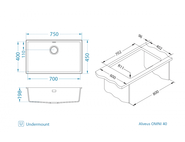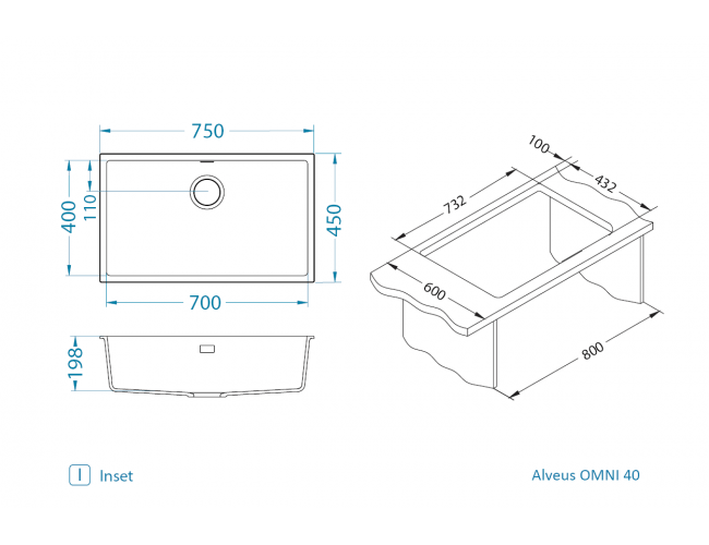 Alveus OMNI granitne sudopere sa uskom gornjom ivicom debljine 7 mm. Dostupno u šest nijansi boja: G11, G22, G55, G81, G91 i G90 (deep black). Tip ugradnje može biti: podgradni (U) i usadni (I). DIMENZIJA SUDOPERE 750 x 450 mm DIMENZIJA POSUDE 700 x 400 x 198 mm