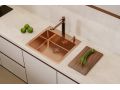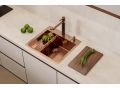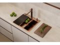 Kuhinjske sudopere PURE se odlikuju prefinjenim dizajnom, čistih linija i besprekornog sjaja, a izrađene su od plemenitog nerđajućeg čelika AISI 304 (CrNi 18-10). Dostupne su u 7 različitih modela sa strukturom površine KMB (satenska posuda, brušeni sjaj) . Sa natprosečnom dubinom do 205 mm, debljinom lima 1 mm, i radijusom od 15 mm, vaša kuhinja može imati veoma elegantan dizajn i buditi želju za neprestanim pranjem suđa. Velika prednost ovih sudopera je mogućnost F i S ugradnje, čime sudopera Pure postaje jedno sa kuhinjskim pultom. Načini ugradnje mogu biti: potpuno usadni(F) i površinsko usadni(S). Garancija na sudopere je 5 godina. Sudopere Pure se isporučuju sa sifonom Dimenzije: 565 x 525 x 195 Dodatna oprema: Drvena daska za rezanje Dozer PEAR ROLL up oceđivač Posuda za oceđivanje Staklena daska za rezanje